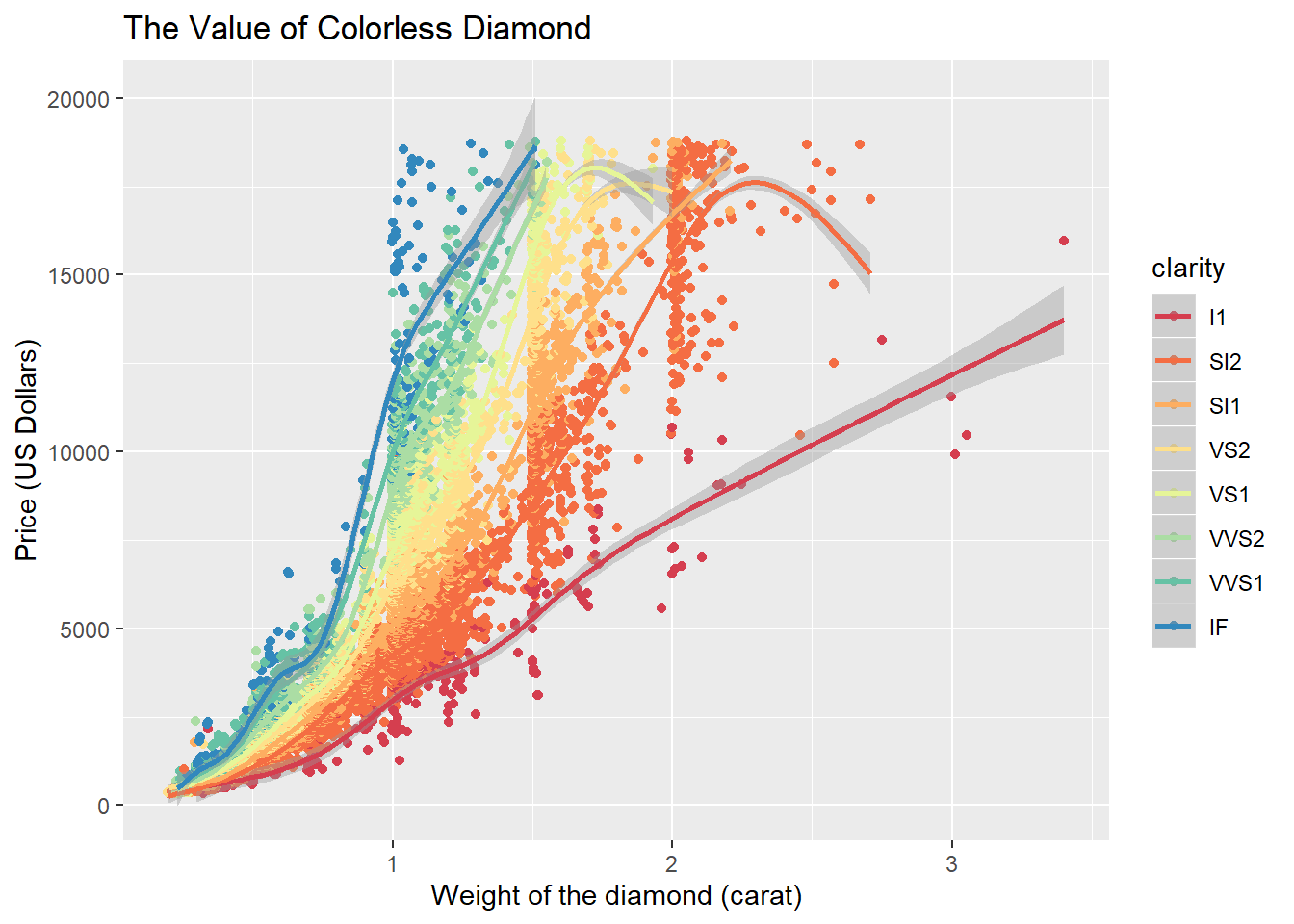 labs(x="Weight of the diamond (carat)", y = "Price (US Dollars)",