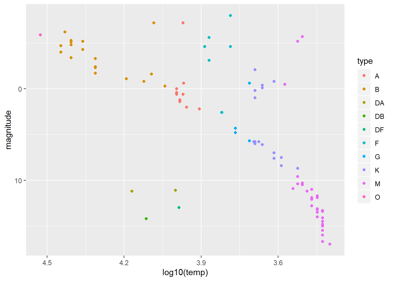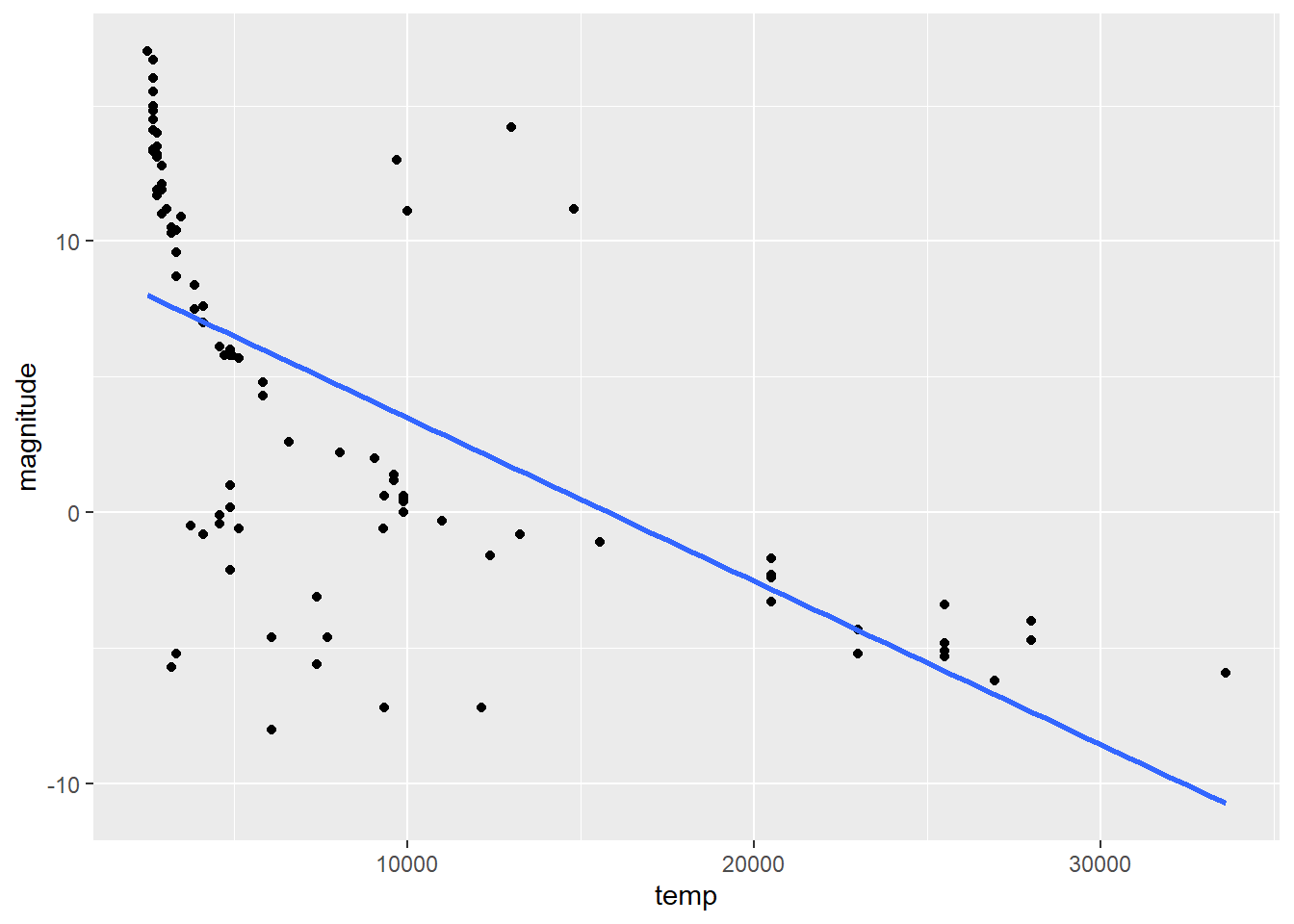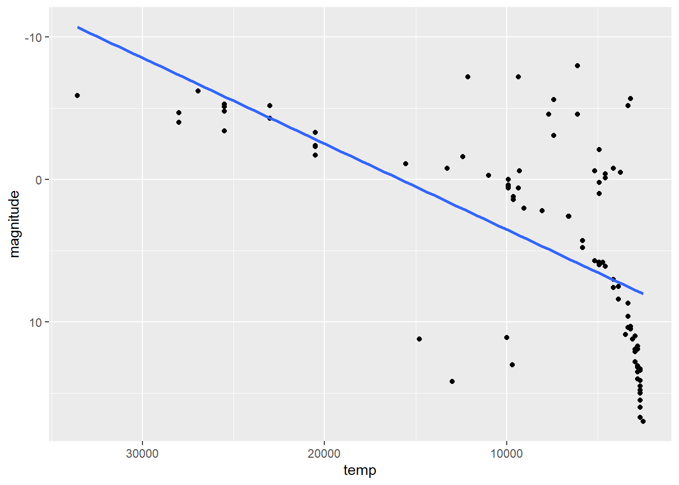 ggplot(aes(x = stars$temp, y = stars$magnitude))+